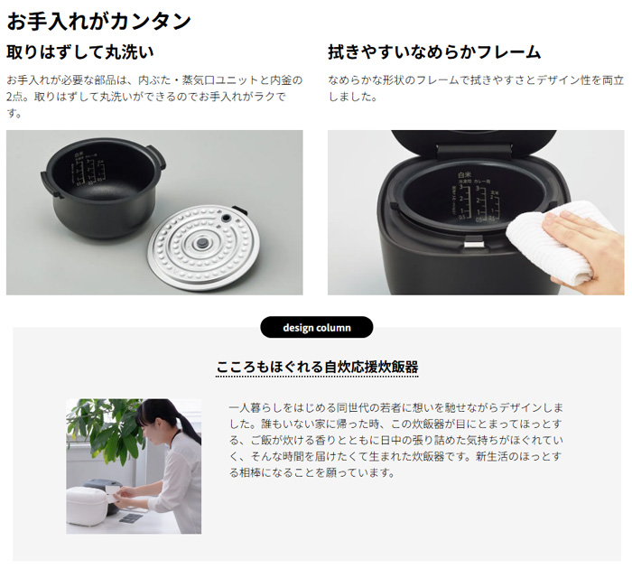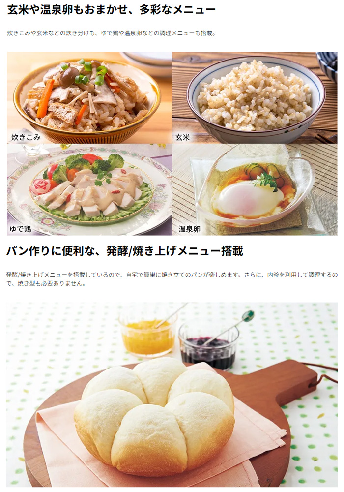 ●自炊を楽しくする、置いて絵になる炊飯器 ●ふっくらおいしく炊飯、3mm厚釜&球面炊き ●多彩な炊き分け、調理メニュー ●使いやすさのこだわり、天面操作・取っ手つき内釜・お手入れもカンタン ●パン作りに便利な、発酵/焼き上げメニュー搭載 ●スタイリッシュ&使用時に光るLED表示 ●すっきり収納 コードリール式電源プラグ ●水加減が見やすい「くっきり水位目盛」 ●内釜でお米が洗える※「Wコーティング内釜」 ●拭きやすいなめらかフレーム 【仕様】 容量:0.5~3合 内釜:圧釜3mm 蓋:ワンプッシュ 質量:2.7kg タイマー:12時間 電源コード:1m 調理コース:パン 炊飯時間:50~60分(メニュー白米) 消費電力:350W 付属品:しゃもじ、米用計量カップ、取扱説明書(保証書付) |