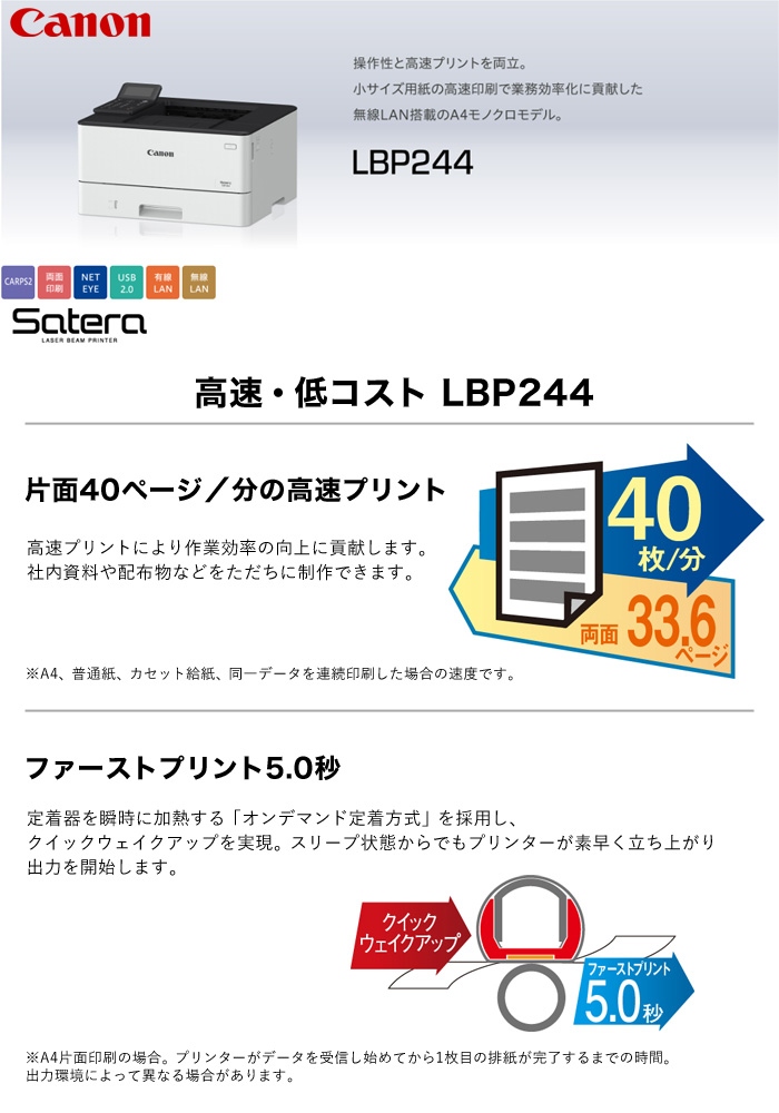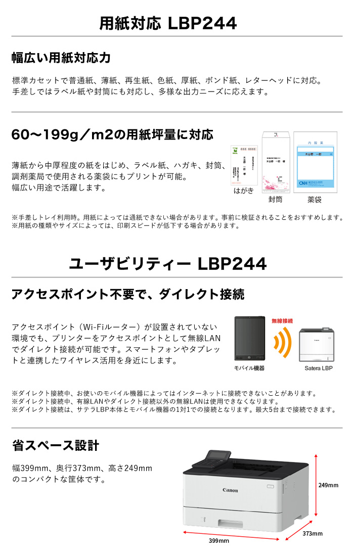 | LBP241 A4モノクロレーザープリンター | LBP244 A4モノクロレーザープリンター | LBP453i A3モノクロレーザープリンター |