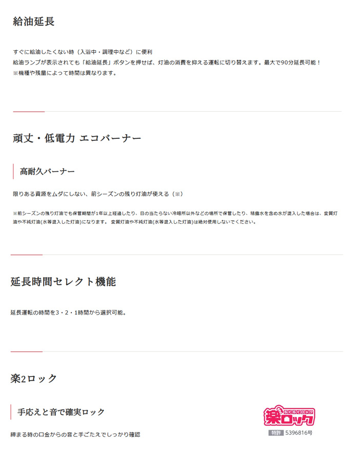●静音タイプ ●トヨトミだけの室温を徐々に下げるエコモードで快適にムリなくムダなく灯油を節約 ●前シーズンに残った灯油もトヨトミなら無駄なく燃焼できる ●灯油切れになりそうな時に最大90分間運転延長 ●消火時のニオイを抑える消臭システム ●本体全体3年保証 【仕様】 畳数:9~12畳 暖房能力:3.25kW 燃焼継続時間:15.8~64.9時間 タンク容量:5L 省エネ機能:有り 消費電力:5~12W |
