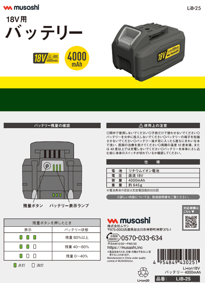 ムサシ LiB-25 バッテリー 18V 4000mAh LiB25 |