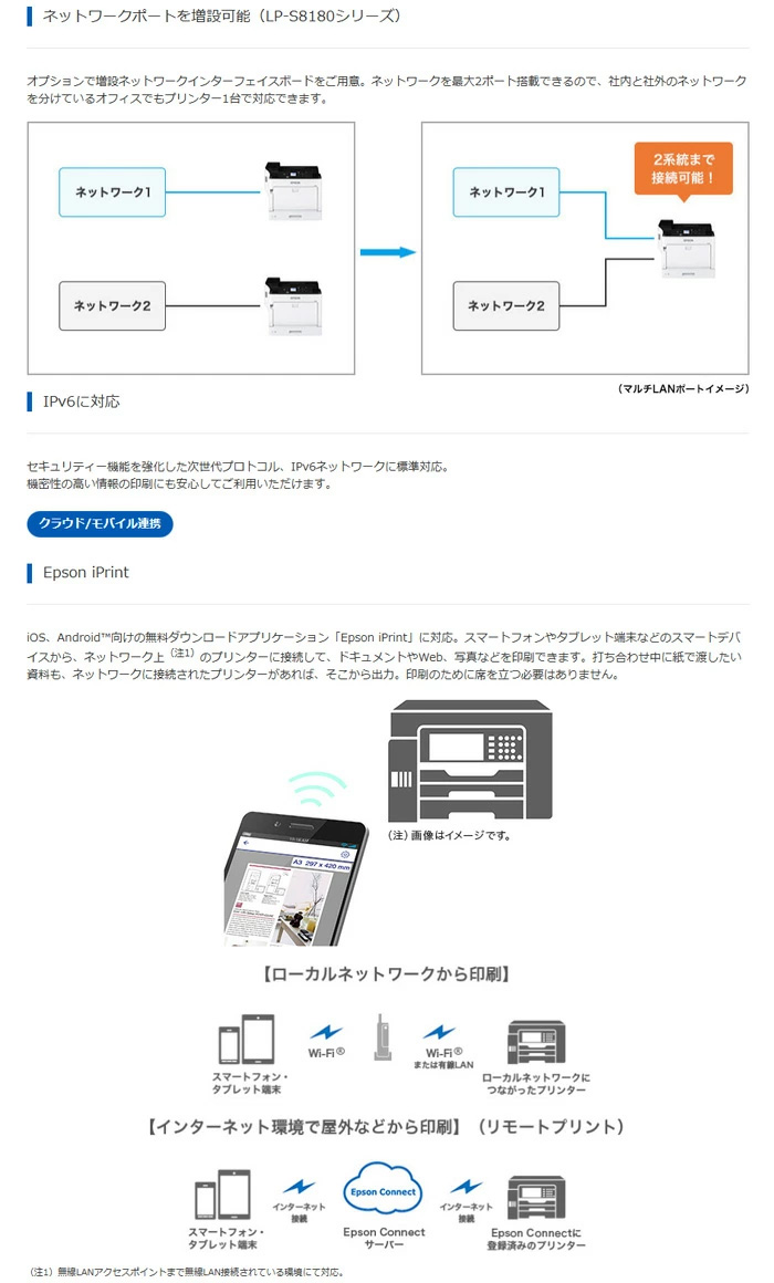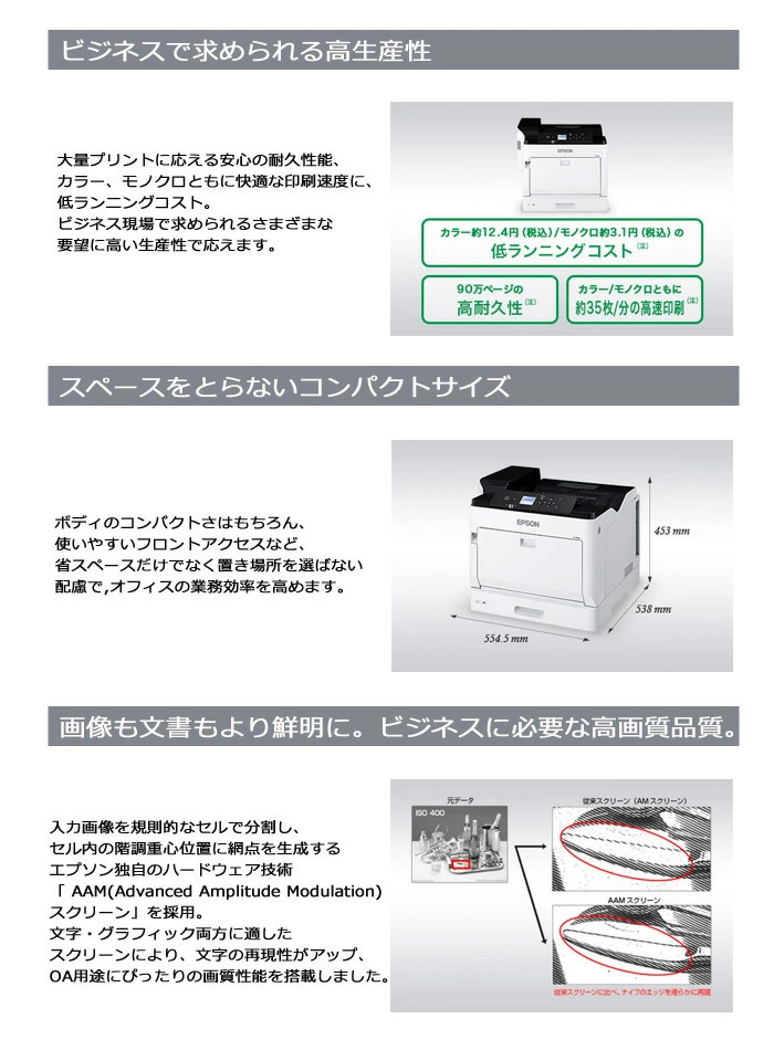※こちらの商品は、【LP-S7180】のキャンペーンモデルとなります。 商品仕様は【LP-S7180】と同仕様となります。 ●商品名:A3カラーページプリンター ●型番:LP-S7180 ●メーカー:エプソン ●本体サイズ: 使用時:554.5×906×453(mm) 収納時:554.5×538×453(mm) ●本体重量:約45.9kg ●プリント方式:レーザー方式(半導体レーザービーム走査+乾式二成分電子写真方式) ●電源:電圧:AC100V±10%、周波数50/60Hz ●消費電力:最大 1,120W以下 ●解像度:600×600dpi、1,200×1,200dpi(スクリーン処理により最大9,600×1,200dpi相当) ●印刷スピード:カラー/モノクロ 約30枚/分(A4横)、両面印刷 カラー/モノクロ印刷時:約21ページ/分(A4横) ●自動両面印刷:標準対応 ●対応プロトコル:TCP/IP ●JANコード:4988617336315 ●付属品: ・本体同梱カートリッジ シアン 1本 ・本体同梱カートリッジ マゼンタ 1本 ・本体同梱カートリッジ イエロー 1本 ・本体同梱カートリッジ ブラック 1本 ・電源コード 1本 ・ソフトウェアディスク 1枚 ・セットアップガイド(冊子) 1式 ・使い方ガイド(冊子) 1式 ・保証書発行請求書 ※北海道・沖縄・離島地区は別途送料要確認 |