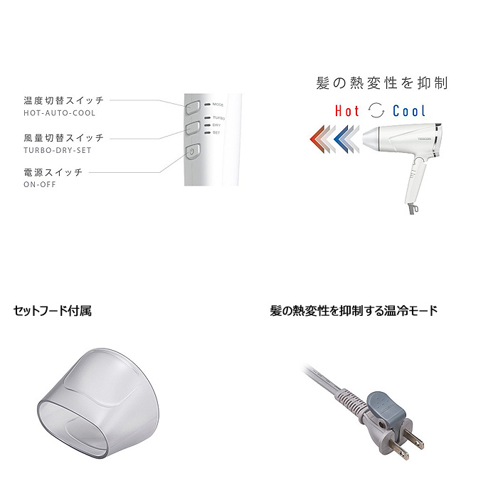 ●ドライヤーメーカー史上最速の速乾力 風量業界最大級※3 2.5m3/分※4(JIS基準) ●消費電力:1400W ●プロテクトイオンで、ドライヤーの課題である静電気を抑制 静電気を抑制、また髪のツヤもUP ●選べる風量3段階×温度3モード タクトスイッチ式でより使いやすい ●温冷風を一定間隔で自動切替 温冷モード搭載 髪の表面温度を適温に保ち、濡れ髪時の熱変性を抑制 ●セットフード付属 ヘアセット時やピンポイントで風を当てたい時にお使いください。 ●ラク抜きプラグ レバーを押すだけでコンセントから簡単に引き抜けます。 ●新開発!小型高効率モーター搭載 速乾はそのままに、軽量化&サイズダウンを実現。 ●メーカー:テスコム TESCOM ●色:ブラック ●本体寸法:幅 217×奥行き 93×高さ 219mm(フード付き) ●本体質量:520g(フード付き) ●消費電力:1400W ●主材料:本体:PC/ABS ●コードの長さ:1.7m ●付属品:セットフード ●スイッチ(1):電源スイッチ ON/OFF ●スイッチ(2):風量切替スイッチ TURBO/DRY/SET ●スイッチ(3):温度切替スイッチ HOT/AUTO/COOL ●風量:2.5m3/分(TURBO使用時) ●温風温度:95℃(周囲温度30℃の場合。DRY-HOT使用時) |