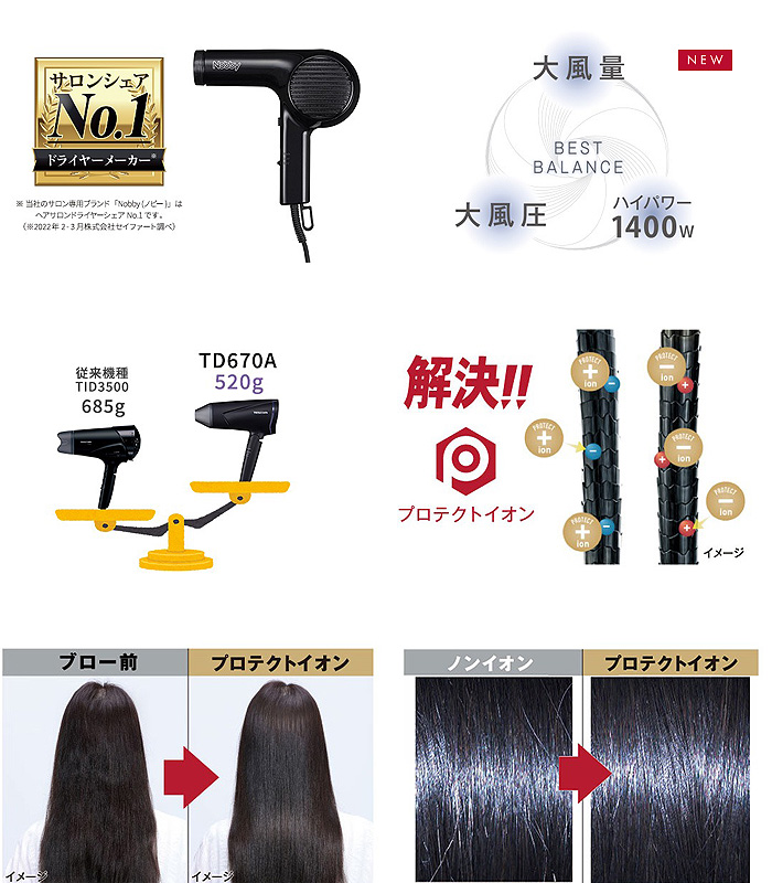 ●ドライヤーメーカー史上最速の速乾力 風量業界最大級※3 2.5m3/分※4(JIS基準) ●消費電力:1400W ●プロテクトイオンで、ドライヤーの課題である静電気を抑制 静電気を抑制、また髪のツヤもUP ●選べる風量3段階×温度3モード タクトスイッチ式でより使いやすい ●温冷風を一定間隔で自動切替 温冷モード搭載 髪の表面温度を適温に保ち、濡れ髪時の熱変性を抑制 ●セットフード付属 ヘアセット時やピンポイントで風を当てたい時にお使いください。 ●ラク抜きプラグ レバーを押すだけでコンセントから簡単に引き抜けます。 ●新開発!小型高効率モーター搭載 速乾はそのままに、軽量化&サイズダウンを実現。 ●メーカー:テスコム TESCOM ●色:ホワイト ●本体寸法:幅 217×奥行き 93×高さ 219mm(フード付き) ●本体質量:520g(フード付き) ●消費電力:1400W ●主材料:本体:PC/ABS ●コードの長さ:1.7m ●付属品:セットフード ●スイッチ(1):電源スイッチ ON/OFF ●スイッチ(2):風量切替スイッチ TURBO/DRY/SET ●スイッチ(3):温度切替スイッチ HOT/AUTO/COOL ●風量:2.5m3/分(TURBO使用時) ●温風温度:95℃(周囲温度30℃の場合。DRY-HOT使用時) |