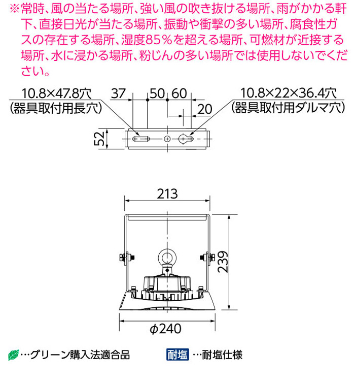 岩崎電気 LED 高天井用照明 LEDioc HIGH-BAY θ (レディオック ハイベイ シータ) クラス1000 水銀ランプ250W・300W相当 メタルハライドランプ250W相当 広角タイプ クリアタイプ EHWP07027W/NSAN9 ※旧形式:EHWP08014W/NSAN9 ●器具光束/14000lm ●消費電力(200V)/73.2W ●固有エネルギー消費効率(200V)/191.2lm/W ●光束維持時間/60000時間(光束維持率90%) ●光源色/昼白色(5000K) ●平均演色評価数/Ra70 ●定格入力電圧/100~242V対応 ●定格周波数/50/60Hz共用 ●保護等級/IP65 ●使用温度範囲/-30℃~+40℃ ※夏季の一時的な高温環境(50℃)に対応します。 ●本体/アルミダイカスト ●前面カバー/強化処理ガラス(クリア) ●アーム/ステンレス ●仕上色/グレイメタリック ●質量/3.2kg ●屋内・軒下用/一般形/電源ユニット内蔵形 ●グリーン購入法適合品 ●耐塩仕様 ※落下防止ワイヤ2本同梱 ※常時、風の当たる場所、強い風の吹き抜ける場所、雨がかかる軒下、直接日光が当たる場所、振動や衝撃の多い場所、腐食性ガスの存在する場所、湿度85%を超える場所、可燃材が近接する場所、水に浸かる場所、粉じんの多い場所では使用しないでください。 |