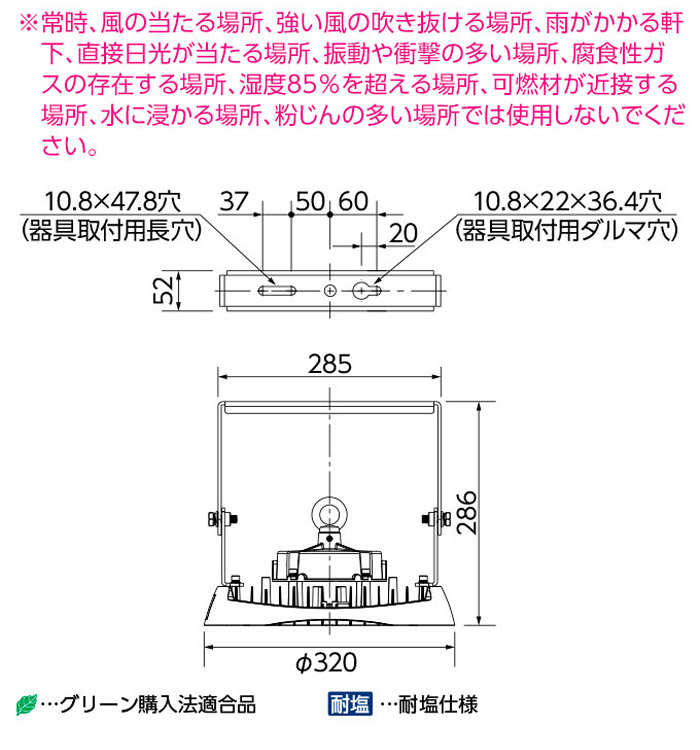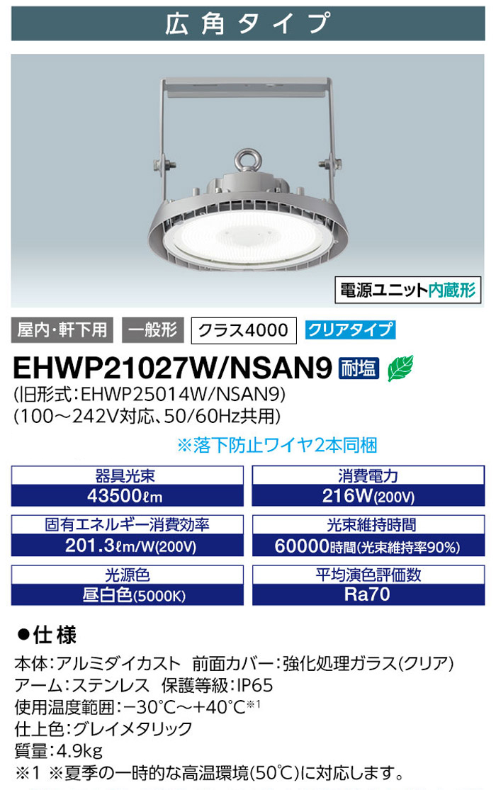 岩崎電気 LED 高天井用照明 LEDioc HIGH-BAY θ (レディオック ハイベイ シータ) クラス4000 水銀ランプ1000W相当 メタルハライドランプ1000W相当 広角タイプ クリアタイプ EHWP21027W/NSAN9 ※旧形式:EHWP25014W/NSAN9 ●器具光束/43500lm ●消費電力(200V)/216W ●固有エネルギー消費効率(200V)/201.3lm/W ●光束維持時間/60000時間(光束維持率90%) ●光源色/昼白色(5000K) ●平均演色評価数/Ra70 ●定格入力電圧/100~242V対応 ●定格周波数/50/60Hz共用 ●保護等級/IP65 ●使用温度範囲/-30℃~+40℃ ※夏季の一時的な高温環境(50℃)に対応します。 ●本体/アルミダイカスト ●前面カバー/強化処理ガラス(クリア) ●アーム/ステンレス ●仕上色/グレイメタリック ●質量/4.9kg ●屋内・軒下用/一般形/電源ユニット内蔵形 ●グリーン購入法適合品 ●耐塩仕様 ※落下防止ワイヤ2本同梱 ※常時、風の当たる場所、強い風の吹き抜ける場所、雨がかかる軒下、直接日光が当たる場所、振動や衝撃の多い場所、腐食性ガスの存在する場所、湿度85%を超える場所、可燃材が近接する場所、水に浸かる場所、粉じんの多い場所では使用しないでください。 |