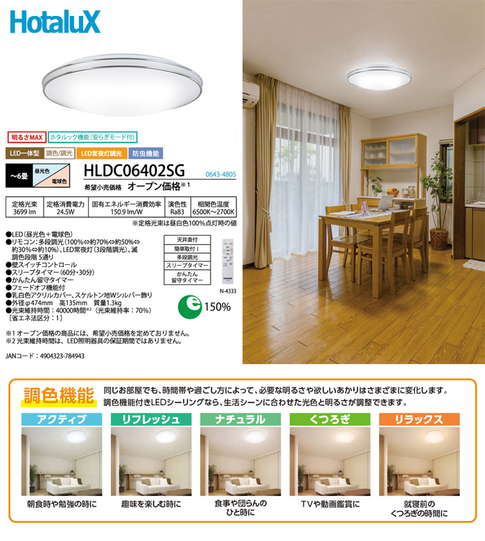ホタルクス/HotaluX(旧NEC) LED シーリングライト Wシルバー飾り 6畳 HLDC06402SG 調光調色/防虫機能 ホタルック機能(安らぎモード付) 明るさMAX/ かんたん留守タイマー/おやすみタイマー 日本製 ●定格光束:3699lm ●定格消費電力:24.5W ●固有エネルギー消費効率:150.9lm/W ●演色性:Ra83 ●相関色温度:6500K~2700K ●LED(昼光色+電球色) ●光束維持時間(時間):40000 (光束維持時間は、LED照明器具の保証期間ではありません。) ●光束維持率(%):70 ●制御機能:リモコン:多段調光(100%⇔約70%⇔約50%⇔約30%⇔約10%)、LED常夜灯(3段階調光)、滅調色段階5通り ●壁スイッチコントロール ●取付方法:簡単取付 ●トップランナー達成率(%): 150 ●省エネ法区分:I ●カバー:乳白色アクリル ●スケルトン地Wシルバー飾り ●外径:φ474 ●高さ(mm):135 ●質量(Kg):1.3 ●リモコン型番:N-4333 JANコード:4904323784943 ※沖縄・離島一部指定地域への配送は別途お見積りとなります。 ぜひお気軽にお問合せください |