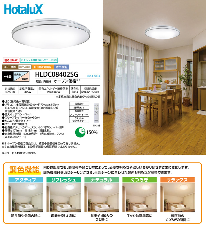 ホタルクス/HotaluX(旧NEC) LED シーリングライト 8畳 HLDC08402SG HLDC08302SGの後継品 調色調光/LED常夜灯調光/防虫機能 ホタルック機能(安らぎモード付) 明るさMAX スリープタイマー/かんたん留守タイマー 日本製 ●定格光束:4299lm(昼白色100%点灯時) ●定格消費電力:28.5W ●固有エネルギー消費効率:150.8lm/W ●演色性:Ra83 ●相関色温度:6500K~2700K ●LED(昼白色+昼光色+電球色) ●リモコン: 多段調光 (100%⇔約70%⇔約50%⇔ 約30%⇔約10%)、LED常夜灯 (3段階調光)滅 調色段階5通り ●リモコン型番:N-4333 ●壁スイッチコントロール ●スリープタイマー (60分・30分) ●かんたん留守タイマー ●フェードオフ機能付 ●乳白色アクリルカバー、スケルトン地Wシルバー飾り ●外径 φ474mm 高135mm 質量1.3kg ●光束維持時間:40000時間(光束維持率 70%) (光束維持時間は、LED照明器具の保証期間ではありません。) JANコード:4904323784936 ※沖縄・離島一部指定地域への配送は別途お見積りとなります。 ぜひお気軽にお問合せください |