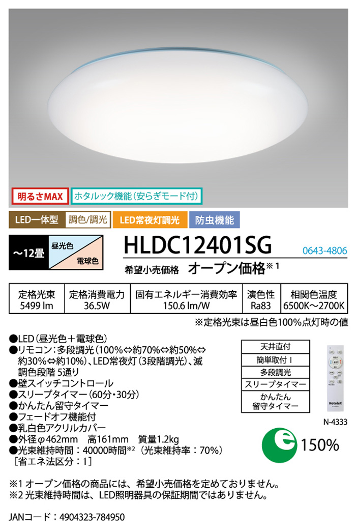 ホタルクス/HotaluX(旧NEC) LED シーリングライト 12畳 HLDC12401SG HLDC12301SGの後継品 調色調光/LED常夜灯調光/防虫機能 ホタルック機能(安らぎモード付) 明るさMAX スリープタイマー/かんたん留守タイマー ●定格光束:5499lm(昼白色100%点灯時) ●定格消費電力:36.5W ●固有エネルギー消費効率:150.6lm/W ●演色性:Ra83 ●相関色温度:6500K~2700K ●LED(昼光色+電球色) ●リモコン: 多段調光 (100%⇔約70%⇔約50%⇔ 約30%⇔約10%)、LED常夜灯 (3段階調光)滅 調色段階5通り ●壁スイッチコントロール ●スリープタイマー (60分・30分) ●かんたん留守タイマー ●フェードオフ機能付 ●乳白色アクリルカバー ●外径 φ462mm 高161mm 質量1.2kg ●光束維持時間: 40000時間(光束維持率 70%) (光束維持時間は、 LED照明器具の保証期間ではありません。) JANコード:4904323784950 ※沖縄・離島一部指定地域への配送は別途お見積りとなります。 ぜひお気軽にお問合せください |