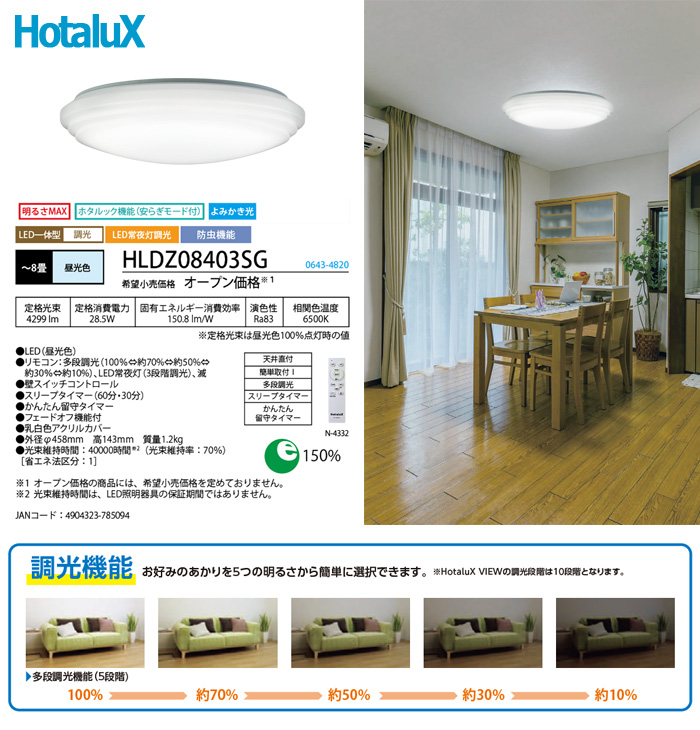 ホタルクス/HotaluX(旧NEC) LED シーリングライト 8畳 HLDZ08403SG HLDZ08303SGの後継品 調光/防虫機能 ホタルック機能(安らぎモード付) 明るさMAX/よみかき光 かんたん留守タイマー/おやすみタイマー 日本製 ●定格光束:4299lm ●定格消費電力:28.5W ●固有エネルギー消費効率:150.8lm/W ●演色性:Ra83 ●光源色:昼光色 ●相関色温度:6500K ●LED(昼光色) ●光束維持時間(時間):40000 (光束維持時間は、LED照明器具の保証期間ではありません。) ●光束維持率(%):70 ●制御機能:リモコン:多段調光(100%⇔約70%⇔約50%⇔約30%⇔約10%)、LED常夜灯(3段階調光)、滅/壁スイッチコントロール ●取付方法:簡単取付 ●トップランナー達成率(%):150 ●省エネ法区分:I ●カバー:乳白色アクリル ●外径:φ458 ●高さ(mm):143 ●質量(Kg):1.2 ●リモコン型番:N-4332 JANコード:4904323785094 ※沖縄・離島一部指定地域への配送は別途お見積りとなります。 ぜひお気軽にお問合せください |