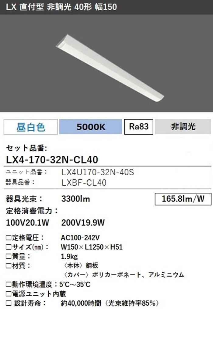 アイリスオーヤマ LX4-170-32N-CL40 LED ベースライト LX3-170-33N-CL40の後継 直付型 40形 幅150mm 昼白色 3300lm |