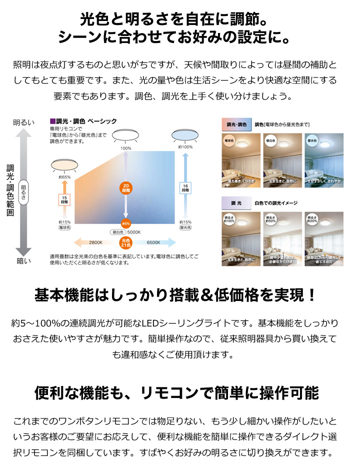 東芝 NLEH08047E-LC LEDシーリングライト 8畳 調光/調色/タイマー機能搭載 発売日:2025年8月1日 ●メーカー:東芝 TOSHIBA ●型番:NLEH08047E-LC ●適用畳数:~8畳 ●光色:調色対応(電球色~昼光色) ●リモコン:有 ●固有エネルギー消費効率:124.2lm/W(4.299lm・34.6W) ●色温度:電球色(2000K)~昼光色(6500K) ●常夜灯:有(6段階調光) ●調光機能:有(5%~100%・全灯時) ●タイマー機能:有(ON/OFFタイマー・ゆっくりおやすみタイマー/30分・60分) ●寸法:径φ585mm×高さ105mm ●質量:2.0kg JAN:4580625133636 ※沖縄・離島一部指定地域への配送は別途お見積りとなります。 ぜひお気軽にお問合せください |