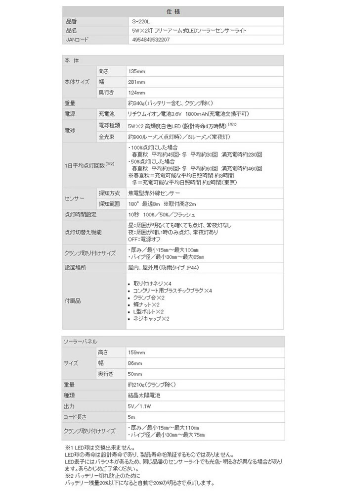 【Mmusashi 日本一のセンサーライトメーカー】 ソーラーバッテリー切れ防止の 自動省エネモード機能/夜通し点灯機能で安心◎ フリーアーム式で方向自在! 明るさ切り替え可能☆ミ 配線いらずでどこでも設置可能! 自由自在に照らせるフリーアーム式! ●送料無料! ●メーカー:株式会社ムサシ ●ブランド名:RITEX ライテックス ●商品名:5W×2灯 フリーアーム式LEDソーラーセンサーライト ●品番:S-220L ●JANコード:4954849532207 ●本体サイズ(mm):高さ135×幅281×奥行124 ●重量:約340g(バッテリー含む、クランプ除く) ●電源:充電池:リチウムイオン電池3.6V 1800mAh(充電池交換不可) ●電球:電球種類:5W×2 高輝度白色LED(設計寿命4万時間) ※LED球は交換できません。 LED球の寿命は設計寿命であり製品寿命を保証するものではありません。 LED素子にはバラツキがあるため同じ品番のセンサーライトでも 光色・明るさが異なる場合があります。 予めご了承ください。 全光束:約900ルーメン(点灯時)6ルーメン(常夜灯) ●1日平均点灯回数:・100%点灯にした場合 春夏秋 平均約45回・冬 平均約30回 満充電時約230回 ・50%点灯にした場合 春夏秋 平均約95回・冬 平均約60回 満充電時約460回 ※春夏秋=充電可能な平均日照時間 約3時間 冬=充電可能な平均日照時間 約2時間(東京) ※バッテリー切れ防止のために バッテリー残量20%以下になると自動で 20%の明るさで点灯します。 ●センサー:探知方式:焦電型赤外線センサー 探知範囲:180°最遠8m※取付高2m ●点灯時間設定:10秒 100%/50%/フラッシュ ●点灯切替機能:昼:周囲が明るくても暗くても点灯、常夜灯なし 夜:周囲が暗い時のみ点灯、常夜灯あり OFF:電源オフ ●クランプ取付サイズ:・厚み/最小15mm~最大100mm ・パイプ径/最小30mm~最大85mm ●設置場所:屋内、屋外用(防雨タイプIP44) ●付属品:取付ネジ×4 コンクリート用プラスチックプラグ×4 クランプ台×2 蝶ナット×2 L型ボルト×2 ネジキャップ×2 □ソーラーパネル ●サイズ(mm):高さ159×幅86×奥行50 ●重量:約210g(クランプ除く) ●種類:結晶太陽電池 ●出力:5V/1.1W ●コード長さ:5m ●クランプ取付サイズ:厚み/最小15mm~最大110mm パイプ径/最小30mm~最大75mm ※沖縄・離島一部指定地域への配送は別途お見積りとなります。 是非お気軽にお問合せ下さい! |