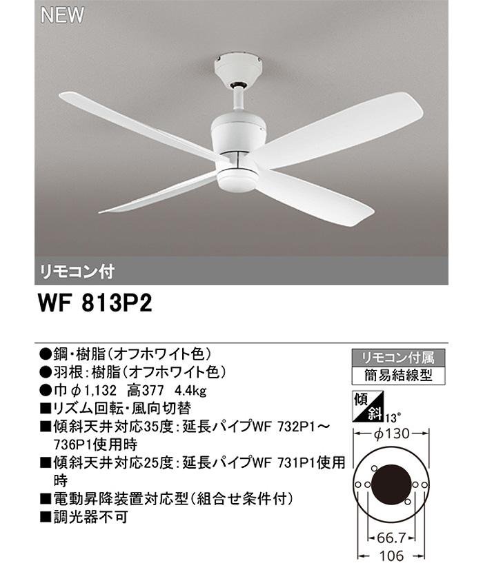 オーデリック シーリングファン DCモーター WF813P2 傾斜天井 照明なし パイプ吊 ホワイト 静音 リモコン付 |